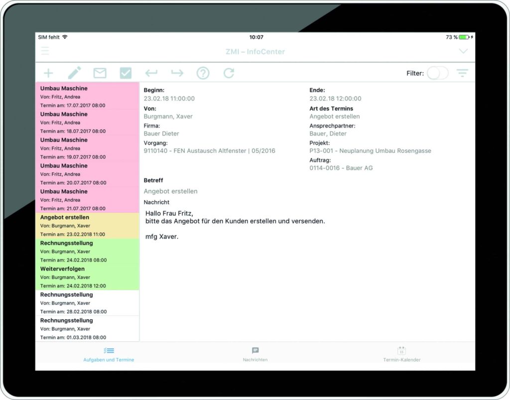 The enhanced ZMI – InfoCenter App for iOS and Android offers the option of accessing the company’s appointment management, task management and personal information system from the ZMI – Organization solution while on the move. Employees on the construction site can be informed of schedule changes at short notice via an integrated messaging function. Time-consuming telephone coordination and the costly provision of information in paper form are no longer necessary.